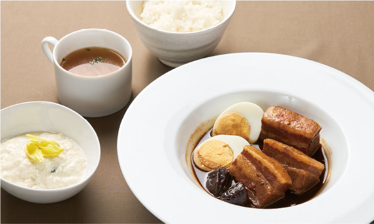 とろとろ角煮、白和え、小鉢、ご飯、スープ