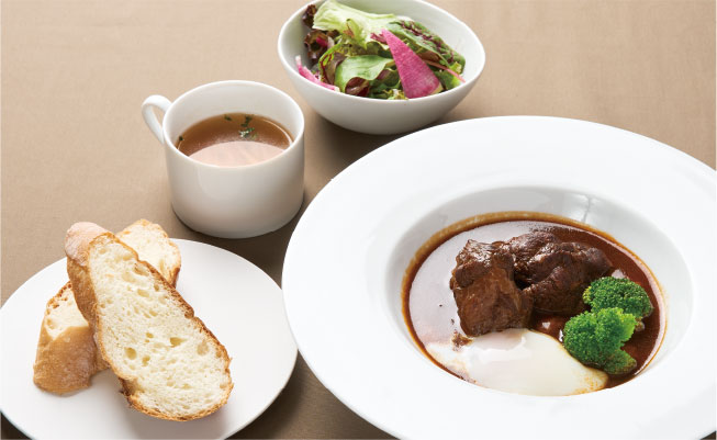 〈ビーフシチュー、サラダ、スープ、パン〉