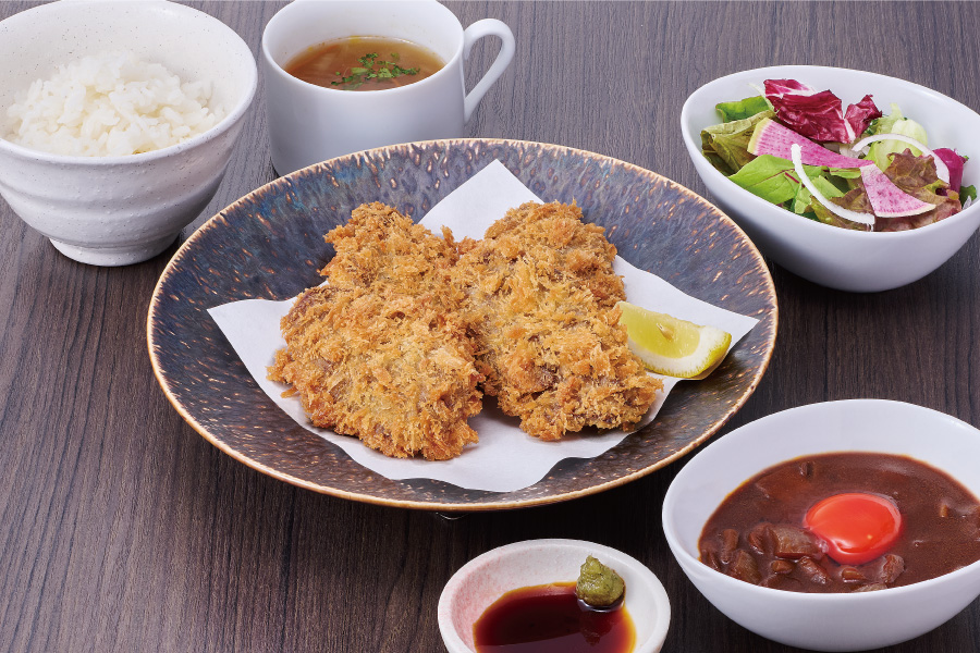 牛サガリ肉のカツを最大限に美味しく味わっていただけるようオリジナルのデミグラスソースをご用意。 卵黄と一緒にお召し上がりください。